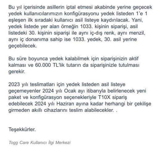 Togg’da ön siparişler 16-27 Mart arasında alınmış, 29 Mart’ta da kura çekilmişti. Kura sonucunda 20 bin kişi ön sipariş hakkı kazanmıştı. Ayrıca, 20 bin kişi de yedek listede.