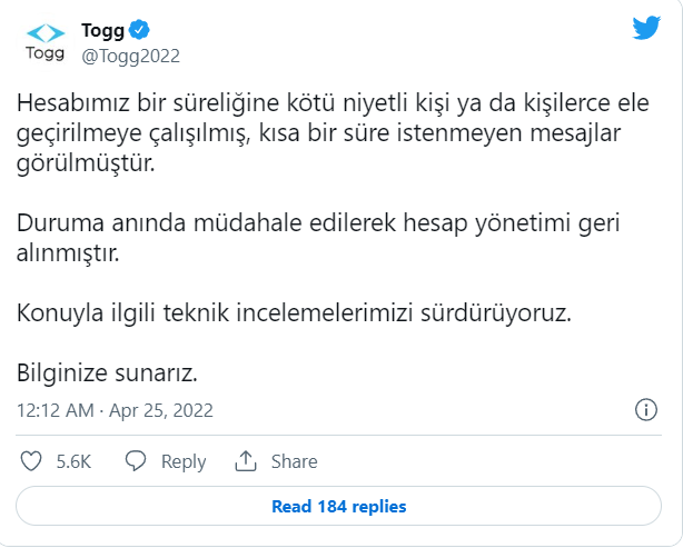 Togg'un Twitter hesabından yapılan açıklamada, "Hesabımız bir süreliğine kötü niyetli kişi ya da kişilerce ele geçirilmeye çalışılmış, kısa bir süre istenmeyen mesajlar görülmüştür. Duruma anında müdahale edilerek hesap yönetimi geri alınmıştır. Konuyla ilgili teknik incelemelerimizi sürdürüyoruz." ifadeleri kullanıldı.