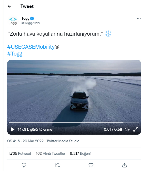 Yerli otomobilin zorlu hava koşullarındaki test sürecine ait video Togg'un resmi Twitter hesabından "Zorlu hava koşullarına hazırlanıyorum" notuyla paylaşıldı.