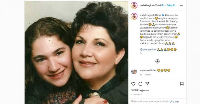 Tomris Çetinel ile kızının eski bir fotoğrafını paylaşan Baykal, "Allah'ım, bu nasıl bir acıdır... Sevgili arkadaşımız, Tomris'imiz biricik evladı Elif Alara’yı kaybetti. Üzüntüm sonsuz... Ne yazacağımı bilemiyorum. Rabbim, Tomi'mize ve sevgili kardeşi Şirin’e dayanma gücü versin, sabır versin. Başka da bir şey diyemiyorum. Huzur içinde uyu güzel kızım. Mekanın cennet olsun..." diyerek, üzüntüsünü ifade etti.