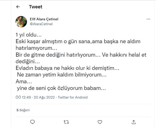 Elif Alara Çetinel, sosyal medya hesabından son mesajını 20 Ağustos'ta paylaşmışı. Geçtiğimiz yıl vefat eden babasına duyduğu özlemi dile getiren Çetinel, "1 yıl oldu... Eski kaşar almıştım o gün sana ama başka ne aldım hatırlamıyorum... Bir de, 'Gitme' dediğini hatırlıyorum ve, 'Hakkını helal et' dediğini... 'Evladın babaya ne hakkı olur ki?' demiştim... Ne zaman yetim kaldım bilmiyorum ama yine de seni çok özlüyorum babam..." satırlarını yayınlamıştı.