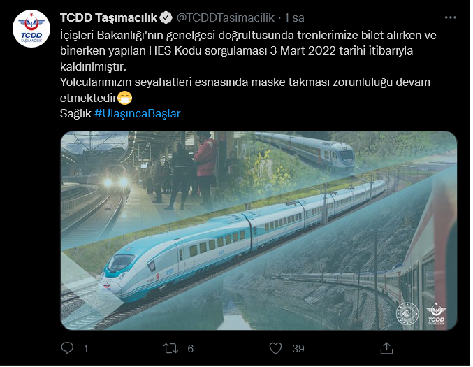 Türkiye Cumhuriyeti Devlet Demiryolları (TCDD) Taşımacılık, Twitter hesabından İçişleri Bakanlığının genelgesi uyarınca bilet alımında ve trene binerken yapılan HES kodu uygulamasının kaldırıldığını açıkladı. Öte yandan TCDD Taşımacılık, yolcukluklarda maske takmanın zorunlu olmaya devam ettiğini bildirdi.TCDD'nin açıklaması şöyle: