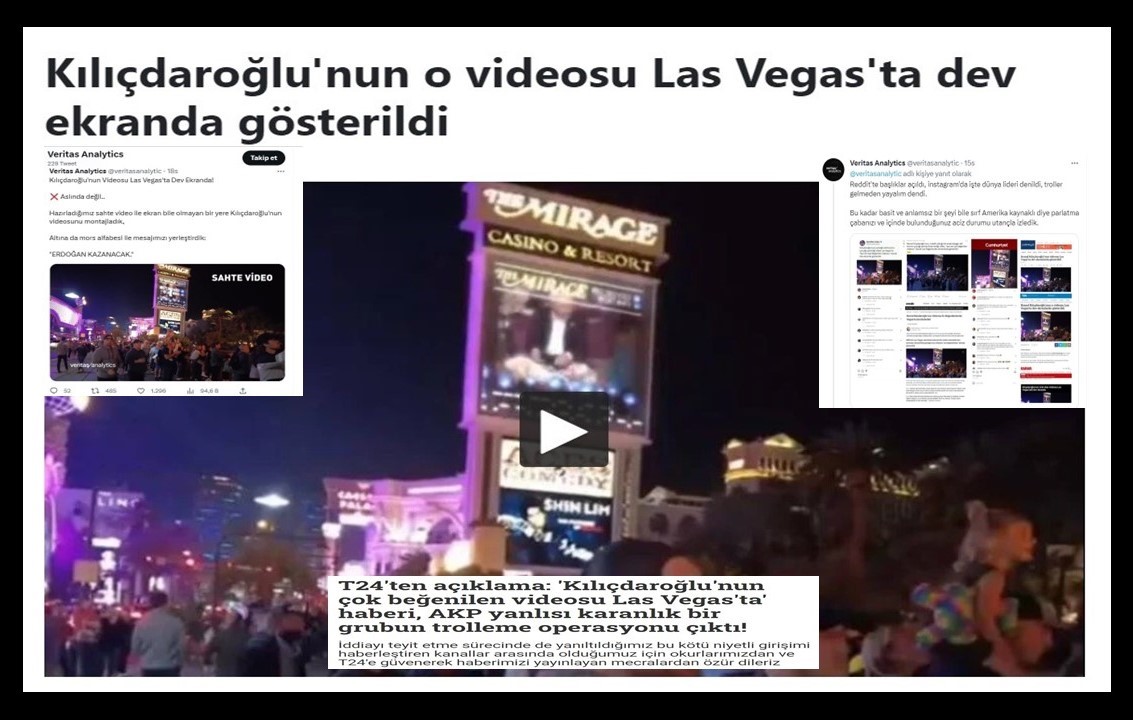 “Kılıçdaroğlu'nun çok beğenilen videosu Las Vegas'ta dev ekranlarda gösterildi” haberi tam bir “trolleme operasyonu”ydu. “Veritas Analytics” adlı bir hesap, bu operasyonu üstlendi.