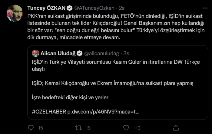 Özkan, DW Türkçe'den Alican Uludağ'ın haberini alıntılıyarak, “PKK'nın suikast girişiminde bulunduğu, FETÖ'nün dinlediği, IŞİD'in suikast listesinde bulunan tek lider Kılıçdaroğlu” paylaşımını yaptı.