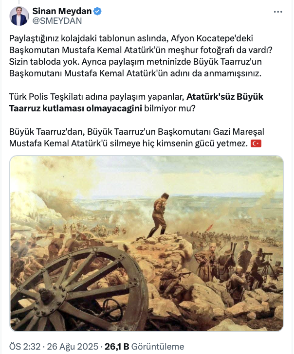 "Paylaştığınız kolajdaki tablonun aslında, Afyon Kocatepe'deki Başkomutan Mustafa Kemal Atatürk'ün meşhur fotoğrafı da vardı? Sizin tabloda yok. Ayrıca paylaşım metninizde Büyük Taarruz'un Başkomutanı Mustafa Kemal Atatürk'ün adını da anmamışsınız. Türk Polis Teşkilatı adına paylaşım yapanlar, Atatürk'süz Büyük Taarruz kutlaması olmayacagini bilmiyor mu? Büyük Taarruz'dan, Büyük Taarruz'un Başkomutanı Gazi Mareşal Mustafa Kemal Atatürk'ü silmeye hiç kimsenin gücü yetmez."