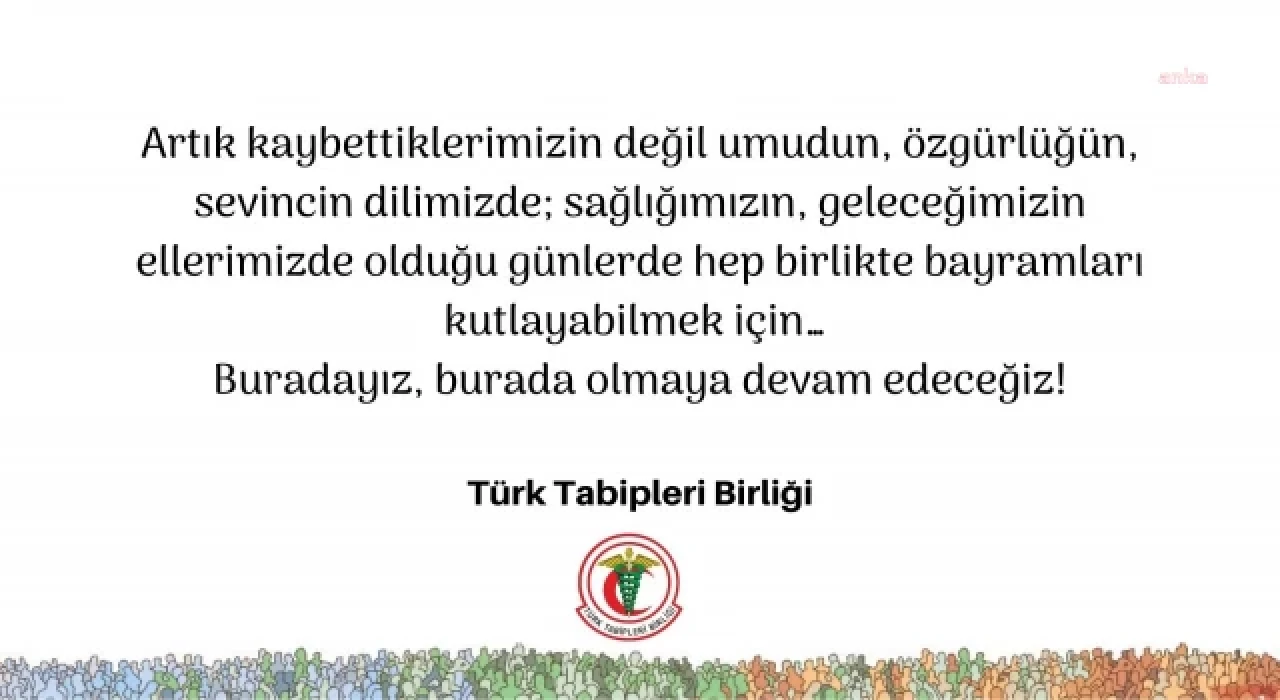 Türk Tabipleri Birliği (TTB), “Artık kaybettiklerimizin değil umudun, özgürlüğün, sevincin dilimizde; sağlığımızın, geleceğimizin ellerimizde olduğu günlerde hep birlikte bayramları kutlayabilmek için… Buradayız, burada olmaya devam edeceğiz” açıklamasını yaptı.