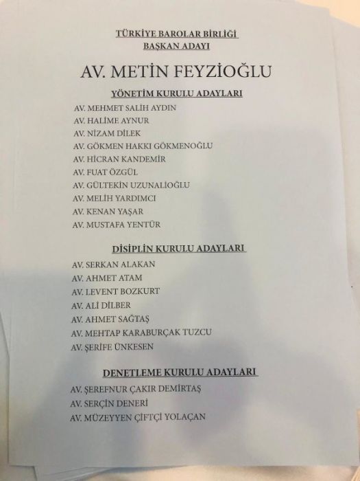 Feyzioğlu’nun listesinde olan diğer baro başkanları ise şu şekilde: Sinop Barosu Başkanı Hicran Kandemir, Bilecik Barosu Başkanı Halime Aynur, Tokat Barosu Başkanı Melih Yardımcı, Çorum Barosu Başkanı Kenan Yaşar, Elazığ Barosu Başkanı Mustafa Yentür.