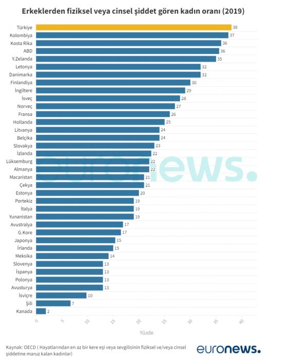 Kadına yönelik erkek şiddeti tüm dünyada büyük bir sorun. OECD verileri “hayatlarından en az bir kere eşi veya sevgilisinin fiziksel ve/veya cinsel şiddetine maruz kalan kadınların oranını” gösteriyor.