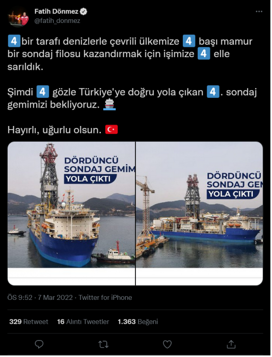 Enerji ve Tabii Kaynaklar Bakanı Fatih Dönmez, Twitter hesabından  hidrokarbon arama çalışmaları için Türkiye'nin dördündü sondaj gemisinin yolda olduğun bildirdi. Dönmez'in paylaşımı şöyle.