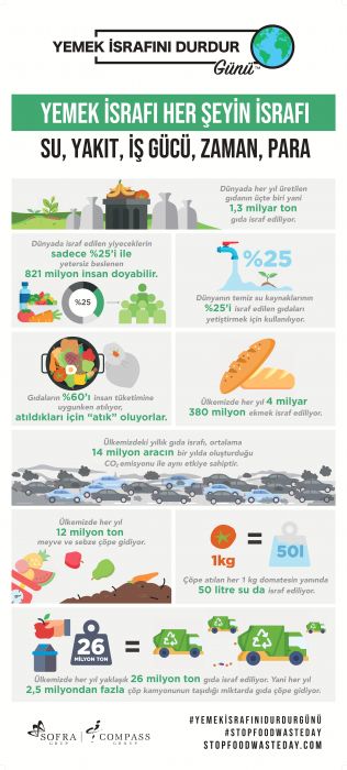 Dünyada her yıl 1,3 milyar, Türkiye'de ortalama 26 milyon ton gıda israf ediliyor. Dünya genelinde israf edilen bu gıdaların yıllık değeri ise 1 trilyon dolar. Dünyanın lider yemek ve destek hizmetler sağlayıcısı Compass Group, günümüzün en büyük küresel sorunlarından biri haline gelen yemek israfı konusuna sosyal sorumluluk bilinciyle yaklaşan kurumlardan biri. Grup, “Yemek İsrafını Durdur Günü” girişimiyle bu yıl da, Türkiye’nin de dahil bulunduğu tüm ülkelerde çeşitli farkındalık çalışmaları gerçekleştirerek, herkesi gıda israfının önüne geçmeye davet ediyor