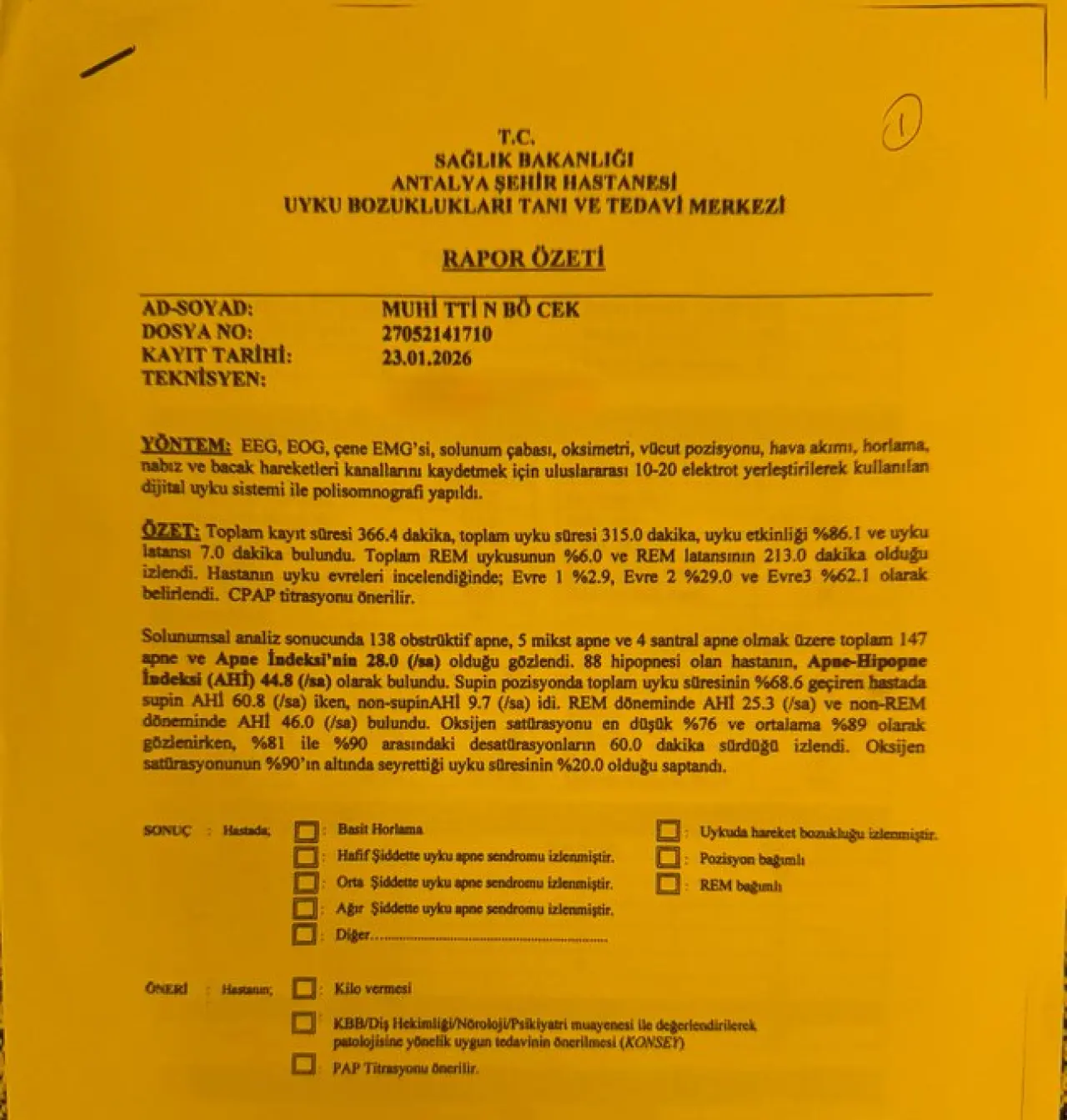 Antalya Büyükşehir Belediye Başkanı Muhittin Böcek’in uyku apnesi raporu, gazeteci Ali Taş tarafından paylaşıldı. 23 Ocak 2026 tarihli uyku testi sonucuna göre, Böcek’in gece boyunca çok sayıda solunum durması yaşadığı belirlendi ve hastalığın ağır seviyede olduğu kaydedildi.
