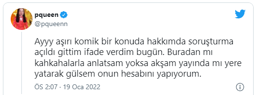 Sosyal medya hesabından olayı duyuran Pqueen, "Ayyy aşırı komik bir konuda hakkımda soruşturma açıldı gittim ifade verdim bugün. Buradan mı kahkahalarla anlatsam yoksa akşam yayında mı yere yatarak gülsem onun hesabını yapıyorum" dedi.