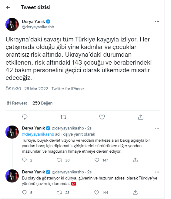 Bakan Yanık, "Ukrayna'daki savaşı tüm Türkiye kaygıyla izliyor. Her çatışmada olduğu gibi yine kadınlar ve çocuklar orantısız risk altında. Ukrayna´daki durumdan etkilenen, risk altındaki 143 çocuğu ve beraberindeki 42 bakım personelini geçici olarak ülkemizde misafir edeceğiz. Türkiye, büyük devlet vizyonu ve vicdanı merkeze alan bakış açısıyla bir yandan barış için diplomatik girişimlerini sürdürürken diğer yandan mazlumları ve mağdurları himaye etmeye devam ediyor. Bu olay da gösteriyor ki dünya, güvenin ve huzurun adresi olarak Türkiye´ye yönünü çevirmiş durumda" dedi.