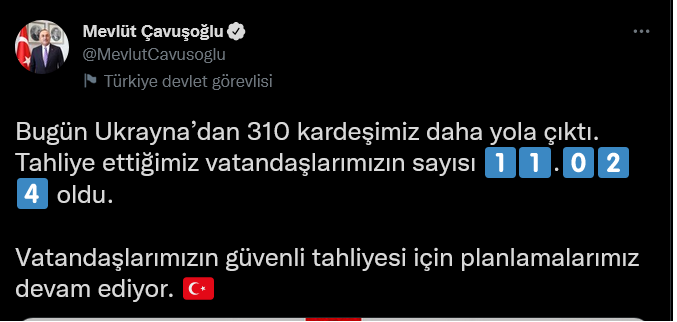 Rusya'nın Ukrayna işgalinin 9. gününde Bakan Çavuşoğlu, Ukrayna'dan tahliye edilen Türk vatandaşlarının sayısını açıkladı. Çavuşoğlu, bugün 310 kişinin tahliye işlemlerinin yürütüldüğünü belirterek tahliye edilen Türk vatandaşlarının sayısının 11 bin 024'e çıktığını bildirdi. Çavuşoğlu'nun paylaşımı şöyle: