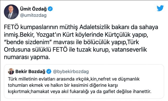 Adalet Bakanı Bekir Bozdağ, sosyal medya hesabından "Türk milletinin evlatları arasında ırkçılık, kin, nefret ve düşmanlık tohumları ekmek ve halkın bir kesimini diğerine karşı kışkırtmak; hamakat veya akıl fukaralığı ya da gaflet değilse ihanettir" sözleriyle yaptığı paylaşıma Zafer Partisi Genel Başkanı Ümit Özdağ, tepki gösterdi.