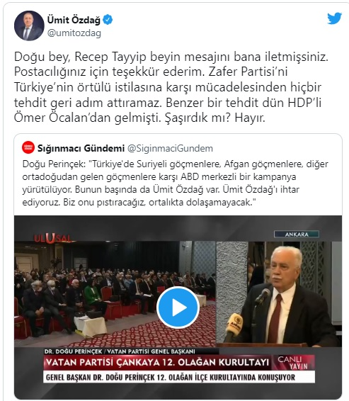 "Doğu bey, Recep Tayyip beyin mesajını bana iletmişsiniz. Postacılığınız için teşekkür ederim. Zafer Partisi’ni Türkiye’nin örtülü istilasına karşı mücadelesinden hiçbir tehdit geri adım attıramaz. Benzer bir tehdit dün HDP’li Ömer Öcalan’dan gelmişti. Şaşırdık mı? Hayır."