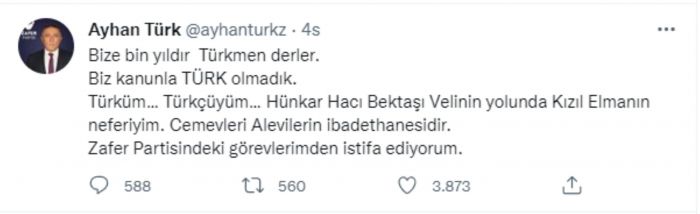 Bize bin yıldır Türkmen derler. Biz kanunla Türk olmadık. Türküm, Türkçüyüm. Hünkar Hacı Bektaşı Velinin yolunda Kızıl Elmanın neferiyim. Cemevleri Alevilerin ibadethanesidir. Zafer Partisindeki görevlerimden istifa ediyorum