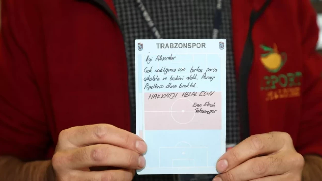 "İyi akşamlar, çok acıktığımız için birkaç parça çikolata ve bisküvi aldık. Parayı pipetlerin altına bıraktık. Hakkınızı helal edin. Eren Elmalı, Trabzonspor." yazılı notu görünce çok duygulandığını anlatan Yıldırım, "Trabzonspor'umuza, yurdumuzun insanına yakışan bir olay yapmışlar. Burada ihtiyaçlarını karşılamışlar, parasını da fazlasıyla bırakmışlar." diye konuştu.