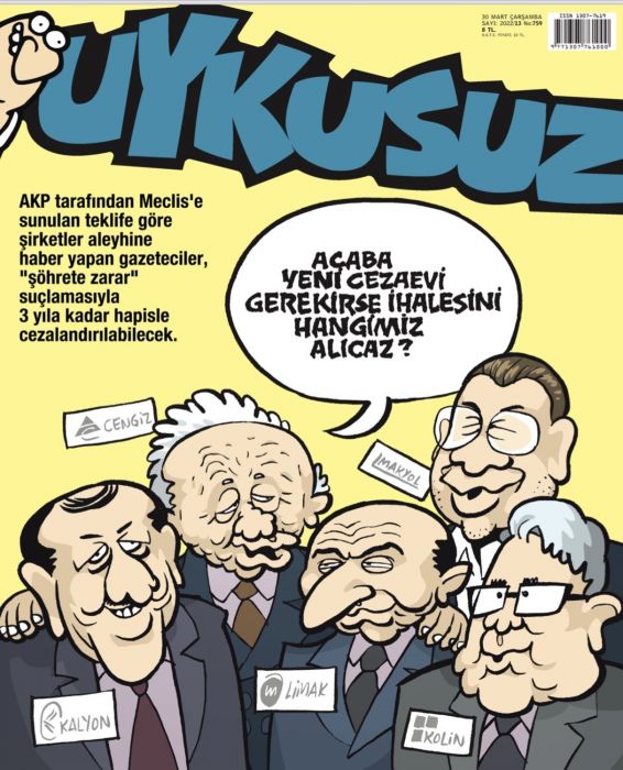 Kapakta “Beşli çete” olarak nitelendirilen Cengiz, Makyol, Limak, Kalyon, Kolin şirketlerinin sahibine yer veren Uykusuz, "Acaba yeni cezaevi gerekirse ihalesini hangimiz alacak” ifadesini konuşma balonu ile gösterdi.