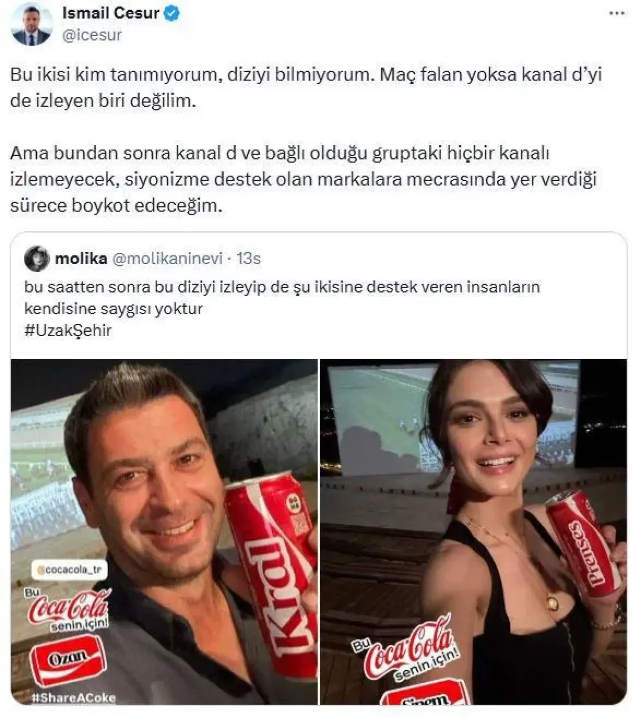 Kanal D ekranlarında yayınlanan "Uzak Şehir" dizisinin başrol oyuncuları Sinem Ünsal ve Ozan Akbaba’nın Coca-Cola reklamında yer alması, İsrail’e destek verdiği iddiaları nedeniyle sosyal medyada tepkiyle karşılandı.