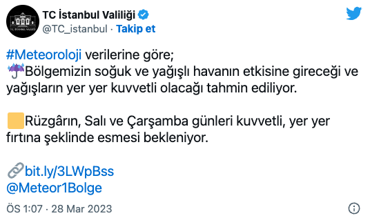 "Bölgemizin 28 Mart 2023 Salı günü balkanlar üzerinden gelen soğuk ve yağışlı havanın etkisine gireceği tahmin ediliyor" denilen açıklamada, "Hava sıcaklıklarının 5-10 derece azalarak mevsim normallerinin altına inmesi bekleniyor. Soğuk havayla birlikte yağışların; Salı günü İstanbul ve bölgenin doğusunda yer yer kuvvetli olması beklenmektedir" ifadeleri kullanıldı.