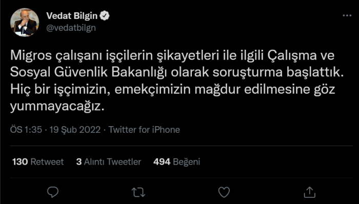 Migros çalışanı işçilerin şikayetleri ile ilgili Çalışma ve Sosyal Güvenlik Bakanlığı olarak soruşturma başlattık. Hiç bir işçimizin, emekçimizin mağdur edilmesine göz yummayacağız.