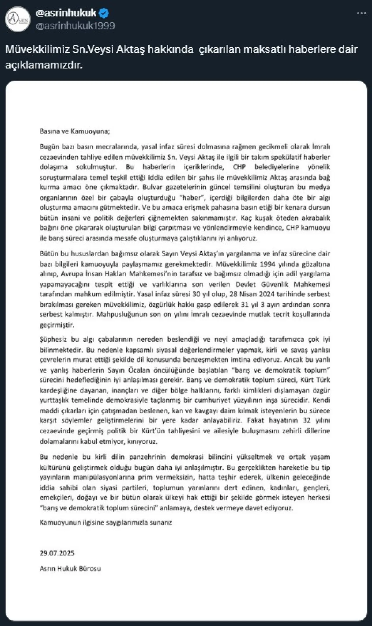 PKK lideri Abdullah Öcalan ile birlikte İmralı Cezaevi’nde tutuklu bulunan ve 30 yıllık cezasının infazını tamamlayarak tahliye edilen Veysi Aktaş hakkında gündeme gelen “CHP’li Aziz İhsan Aktaş ile akraba olduğu” iddialarına, Aktaş’ın avukatları sert tepki gösterdi.
