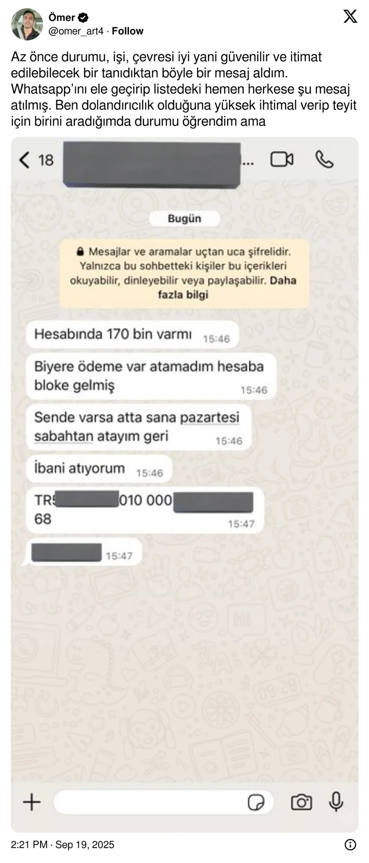 X’teki ‘@omer_art4’ isimli kullanıcı, tanıdığı birinin WhatsApp üzerinden borç istemesi üzerine şüphelendi. Kullanıcının paylaştığı ekran görüntüsünde, bir kişi hesabına bloke geldiğini söyleyip IBAN paylaşarak borç talep ediyordu. Ancak X kullanıcısı mesajın dolandırıcılık amacı taşıdığını fark etti.