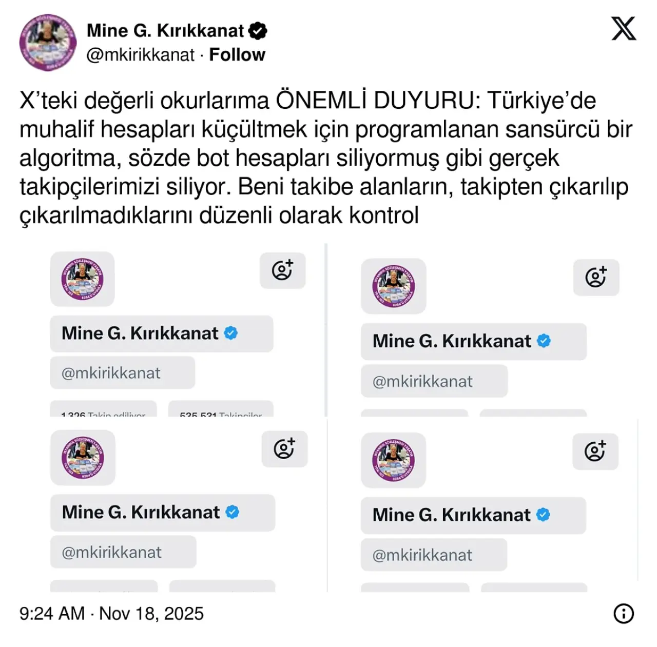 Gazeteci Mine Kırkkanat, sosyal medyada yaptığı paylaşımda, takipçilerine yönelik söz konusu işlemlerin muhalif hesapları küçültmek amacıyla programlandığını iddia etti. Kırkkanat, “Takipçilerimizin çıkarılıp çıkarılmadıklarını düzenli olarak kontrol etmelerini ve çıkarıldılarsa sabırla yeniden takibe almalarını rica ediyorum” ifadelerini kullandı.