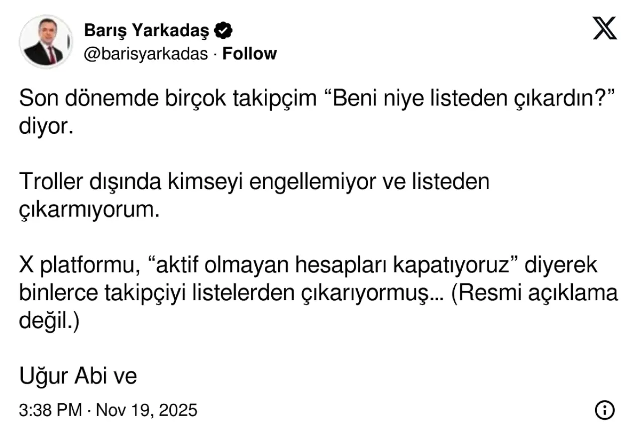 X platformu ise operasyonu, “aktif olmayan hesapları kapatıyoruz” şeklinde açıkladı. Ancak Türkiye’deki muhalif kullanıcılar, işlemlerin algoritmik olarak bazı hesapları hedef aldığı görüşünde. Operasyon, sosyal medyada büyük tartışma yaratmaya devam ediyor.