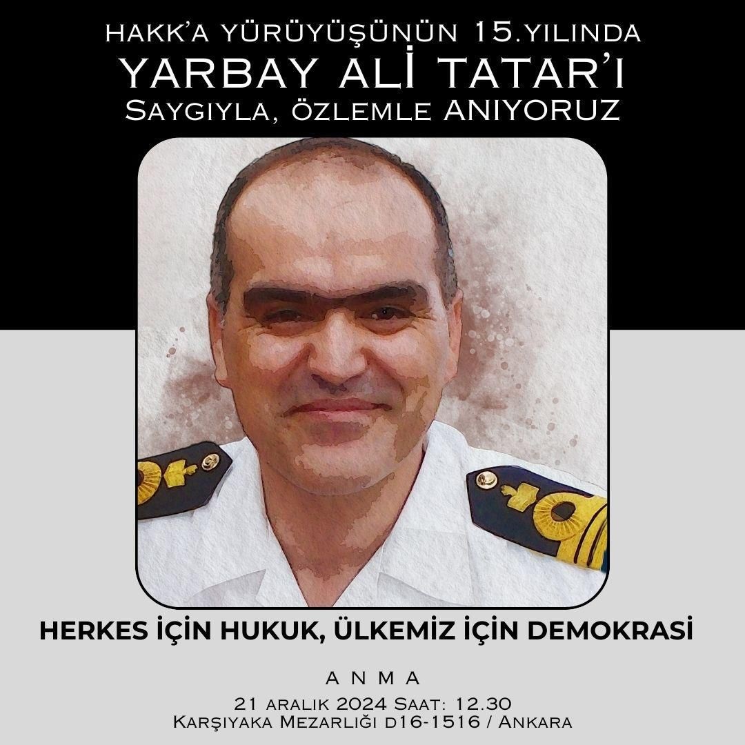 Yarbay Ali Tatar, Hakk'a Yürüyüşünün 15.Yılında 21 Aralık 2024 Cumartesi Günü saat 12.30 da, Karşıyaka Mezarlığındaki kabri başında anılacak.