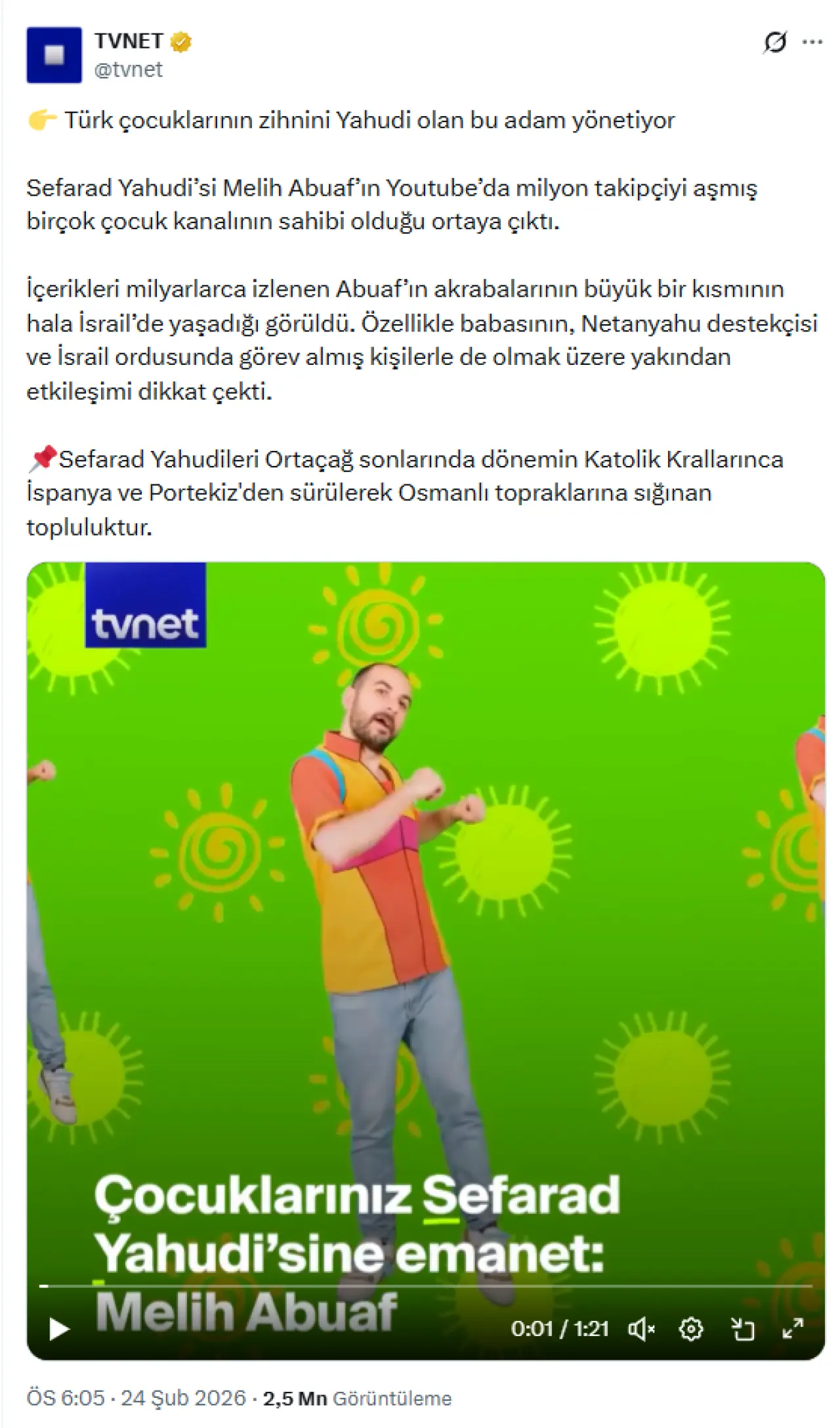Son dönemde TVNET, Yeni Akit ve TRHaber gibi yayın organlarına ait sosyal medya hesaplarında ve internet sitelerinde, YouTube Türkiye'nin tanınmış isimlerinden Melih Abuaf'ı hedef alan organize bir karalama kampanyası başlatıldı. Milyonlarca abonesi bulunan "Çuf Çuf Çocuk Şarkıları", "Karpuz Adam", "Pırtık" ve "Afacan TV" gibi popüler çocuk kanallarının arkasındaki isim olan Abuaf'ın, İspanya'dan Osmanlı Devleti'ne göç eden Sefarad Yahudisi bir aileden gelmesi, söz konusu yayınlarda skandal bir gelişme olarak servis edildi. "Türk çocuklarının zihnini yönetiyor" ve "Çocuklarımızı kime emanet ediyoruz" gibi kışkırtıcı ifadelerle sunulan içerikler, kamuoyunda ayrımcılık tartışmalarını yeniden alevlendirdi.