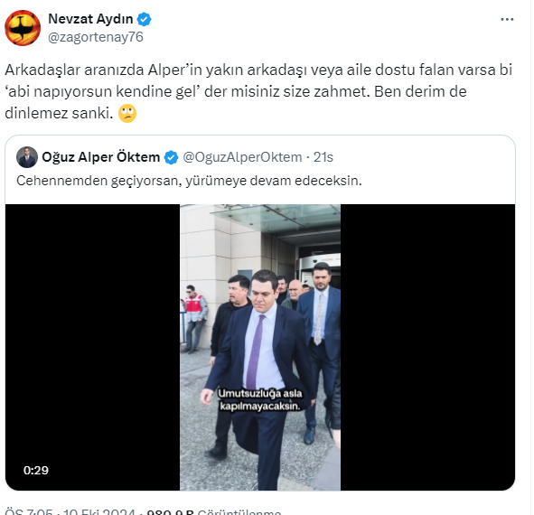Aydın ise bu paylaşımı alıntılayıp ”Arkadaşlar aranızda Alper’in yakın arkadaşı veya aile dostu falan varsa bi ‘abi napıyorsun kendine gel’ der misiniz size zahmet. Ben derim de dinlemez sanki” yorumunu yaptı.