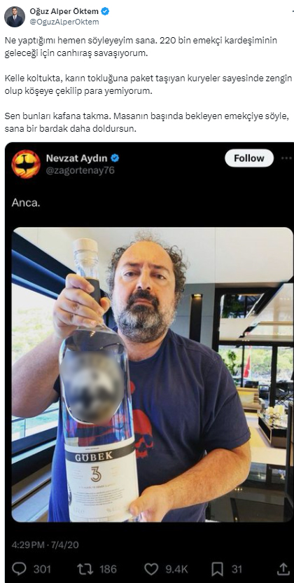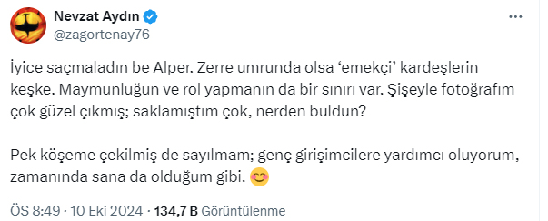 Nevzat Aydın da bu paylaşıma ”İyice saçmaladın be Alper. Zerre umrunda olsa ‘emekçi’ kardeşlerin keşke. Maymunluğun ve rol yapmanın da bir sınırı var. Şişeyle fotoğrafım çok güzel çıkmış; saklamıştım çok, nerden buldun? Pek köşeme çekilmiş de sayılmam; genç girişimcilere yardımcı oluyorum, zamanında sana da olduğum gibi” cevabını verdi.