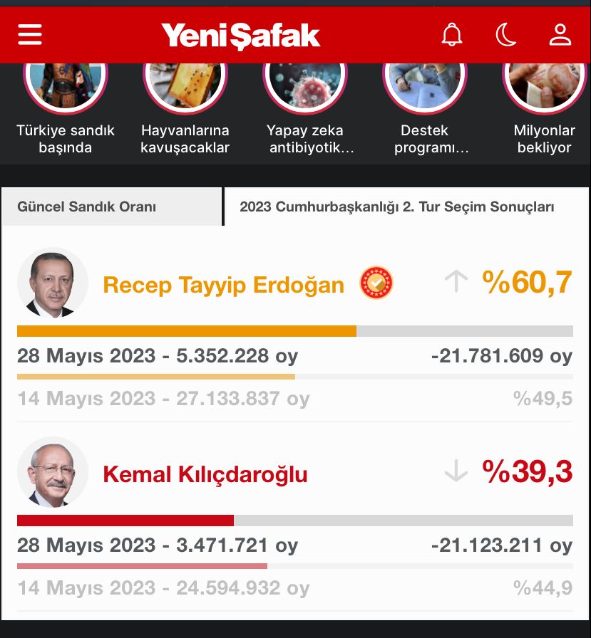 YSK, ikinci tur cumhurbaşkanlığı seçiminin sonuçları için henüz yayın yasağını kaldırmamışken, Tüm televizyon ve internet medyası yayın yasağının kaldırılmasını beklerken, Yeni Şafak yasağı delerek sonuçları vermeye başladı.