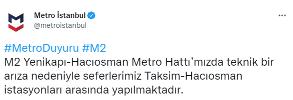 Metro İstanbul'un sosyal medya hesabından yapılan açıklamaya göre, M2 Yenikapı-Hacıosman Metro Hattı’ndaki teknik bir arıza nedeniyle seferler Taksim-Hacıosman istasyonları arasında yapılmaktadır.