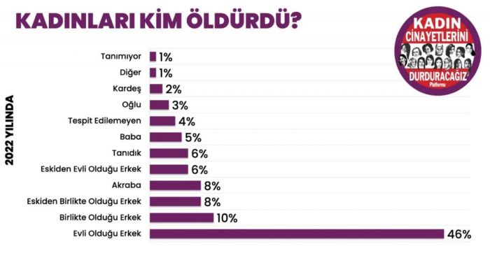 2022 yılında öldürülen 334 kadının 154’ü evli olduğu erkek, 35’i birlikte olduğu erkek, 27’si eskiden birlikte olduğu erkek, 26’sı akrabası, 19’u eskiden evli olduğu erkek, 19’u tanıdık birisi, 17’si babası, 10’u oğlu, 6’sı kardeşi, 4’ü tanımadığı biri, 1’i kendisini bir süredir takip eden erkek, 1’i hastası, 1’i işvereni, 1’i üvey babası tarafından öldürüldü.