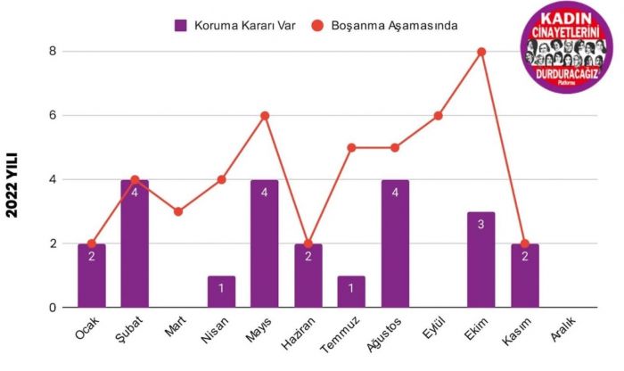 Raporda, 2022 yılında 23 kadının öldürüldüğü anda fail hakkında tedbir kararları olmasına rağmen korunamadığı ve öldürüldüğünde tedbir kararı olan kadınların ise yüzde 50’sinin boşanma aşamasında olduğu erkekler tarafından öldürüldüğü bilgisi yer aldı.