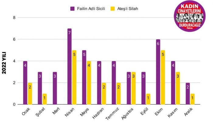 Raporda, 2022 yılında adli sicil kaydı olan faillerin yüzde 60’ının ateşli silahla kadınları öldürdüğü belirtiliyor.