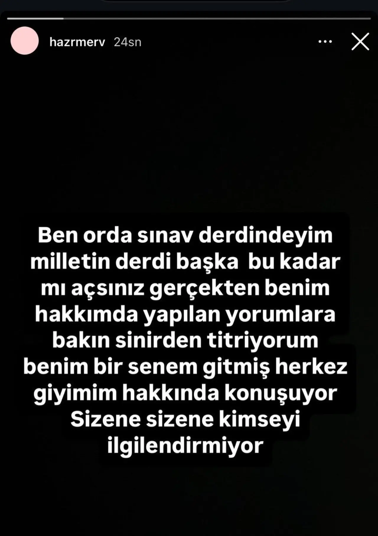 “Ben sınav derdindeyim, milletin derdi başka. Bu kadar mı açsınız gerçekten? Benim hakkımda yapılan yorumlara bakın... Sinirden titriyorum. Benim bir senem gitmiş, herkes giyimim hakkında konuşuyor. Size ne? Kimse ilgilendirmiyor.”
