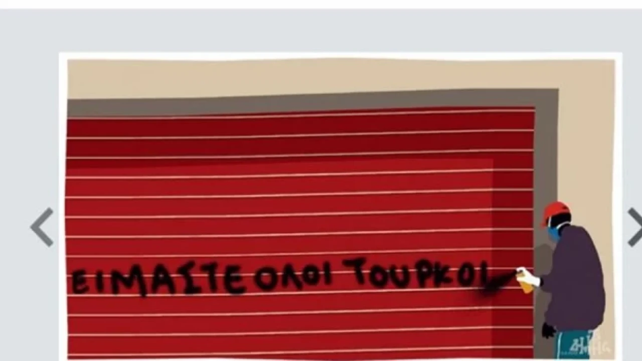 7 Şubat'ta Kathimerini'de yayımlanan Dimitris Handzopulos imzalı karikatürde bir kişinin duvara sprey boyayla, "Hepimiz Türküz" yazması resmediliyor.