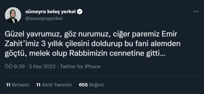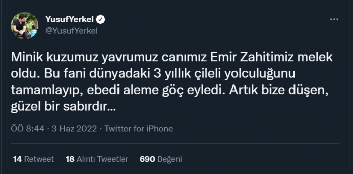 "Minik kuzumuz yavrumuz canımız Emir Zahitimiz melek oldu. Bu fani dünyadaki 3 yıllık çileli yolculuğunu tamamlayıp, ebedi aleme göç eyledi. Artık bize düşen, güzel bir sabırdır…"