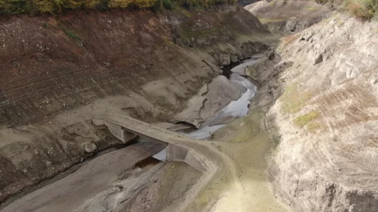 Kocaeli'nin Başiskele ilçesinde bulunan 51 milyon metreküp kapasiteli Yuvacık Barajı'nda su seviyesi yüzde 19’a kadar geriledi. Havadan görüntülenen barajdaki seviye gözler önüne serildi. Görüntülerde barajın büyük bir kısmının kuruduğu görülürken, yıllar önce sular altında kalan köprü ise gün yüzüne çıktı.
