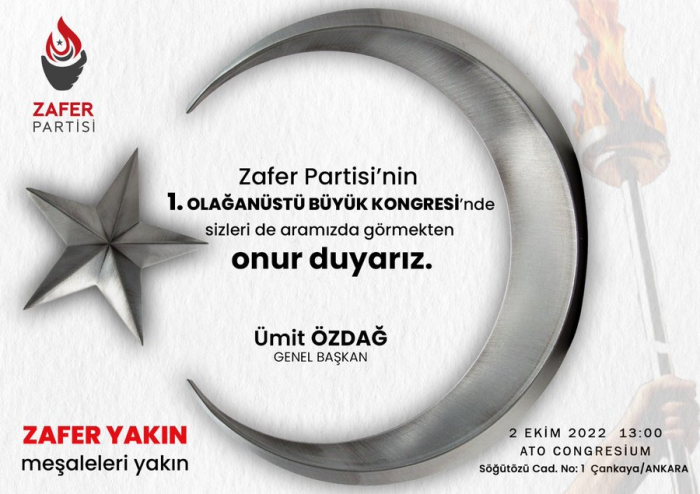 "2 Ekim 2022’de saat 13.00’de Ankara ATO Kongre Salonunda gerçekleştireceğimiz 1. Olağanüstü Büyük Kongremizde bütün yurttaşlarımızı yanımızda görmek isteriz. ZAFER YAKIN, MEŞALELERİ YAKIN…."