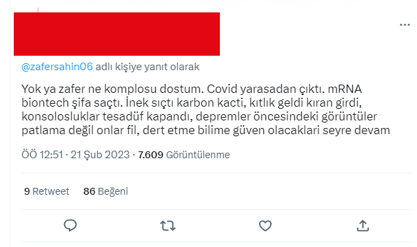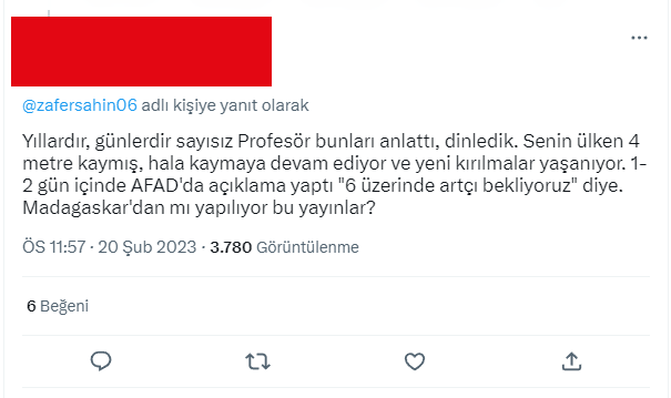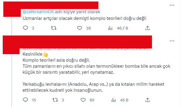 Son dönemde depremlerin meydana gelmesiyle beraber neredeyse her TV kanalında bir deprem programı, o programlarda da konuk deprem bilimciler bölgede gerçekleşen depremlere dair bilimsel açıklamalarda bulunuyorlar. Sadece Kahramanmaraş merkezli depremler için değil, sürekli gündeme gelen İstanbul depremine dair de fikirlerini belirtiyorlar. Şahin’in bu olaylardan haberi olmayarak tweeti attığı düşünülüyor olacak ki, insanlar yaptığı paylaşımın altında deprem uzmanlarının konu hakkındaki fikirlerini dile getirdiğini söylüyorlar. İşte o yanıtlardan birkaçı:
