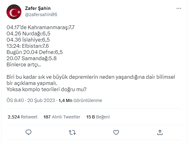 Zafer Şahin Twitter’dan yaptığı paylaşımında önce gerçekleşen depremleri sıraladı: