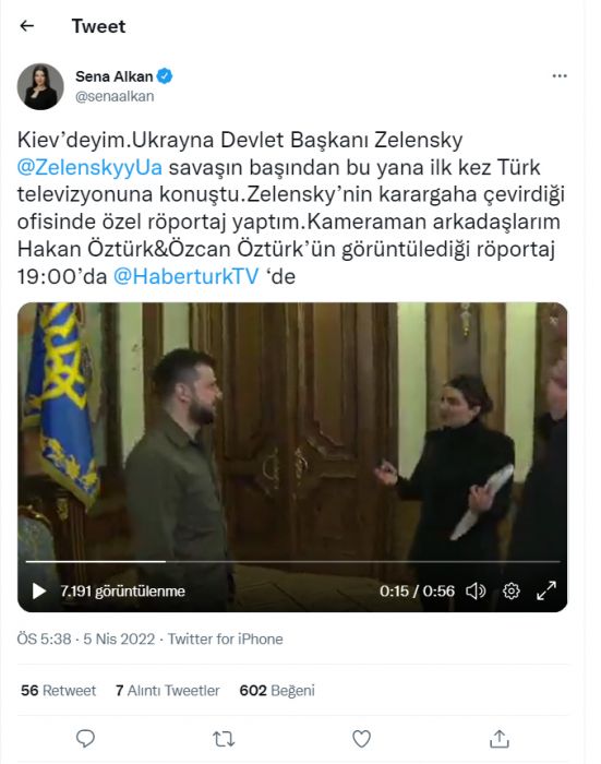 "Kiev’deyim.Ukrayna Devlet Başkanı Zelensky @ZelenskyyUa savaşın başından bu yana ilk kez Türk televizyonuna konuştu.Zelensky’nin karargaha çevirdiği ofisinde özel röportaj yaptım.Kameraman arkadaşlarım Hakan Öztürk&Özcan Öztürk’ün görüntülediği röportaj 19:00’da @HaberturkTV ‘de"