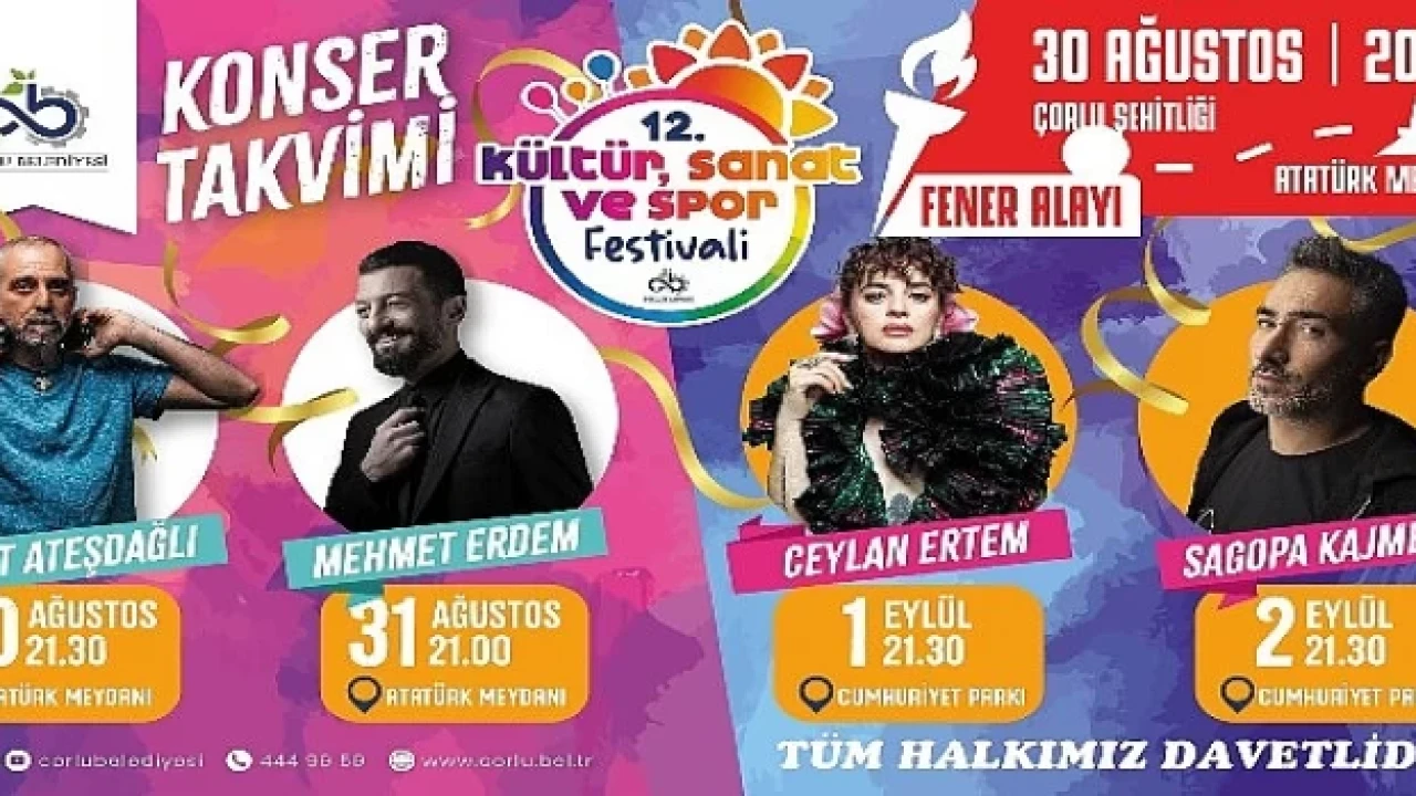 Çorlu Belediyesi tarafından düzenlenen 12. Kültür, Sanat ve Spor Festivali’nde ücretsiz olarak düzenlenecek etkinliklere tüm halkımız davetlidir.