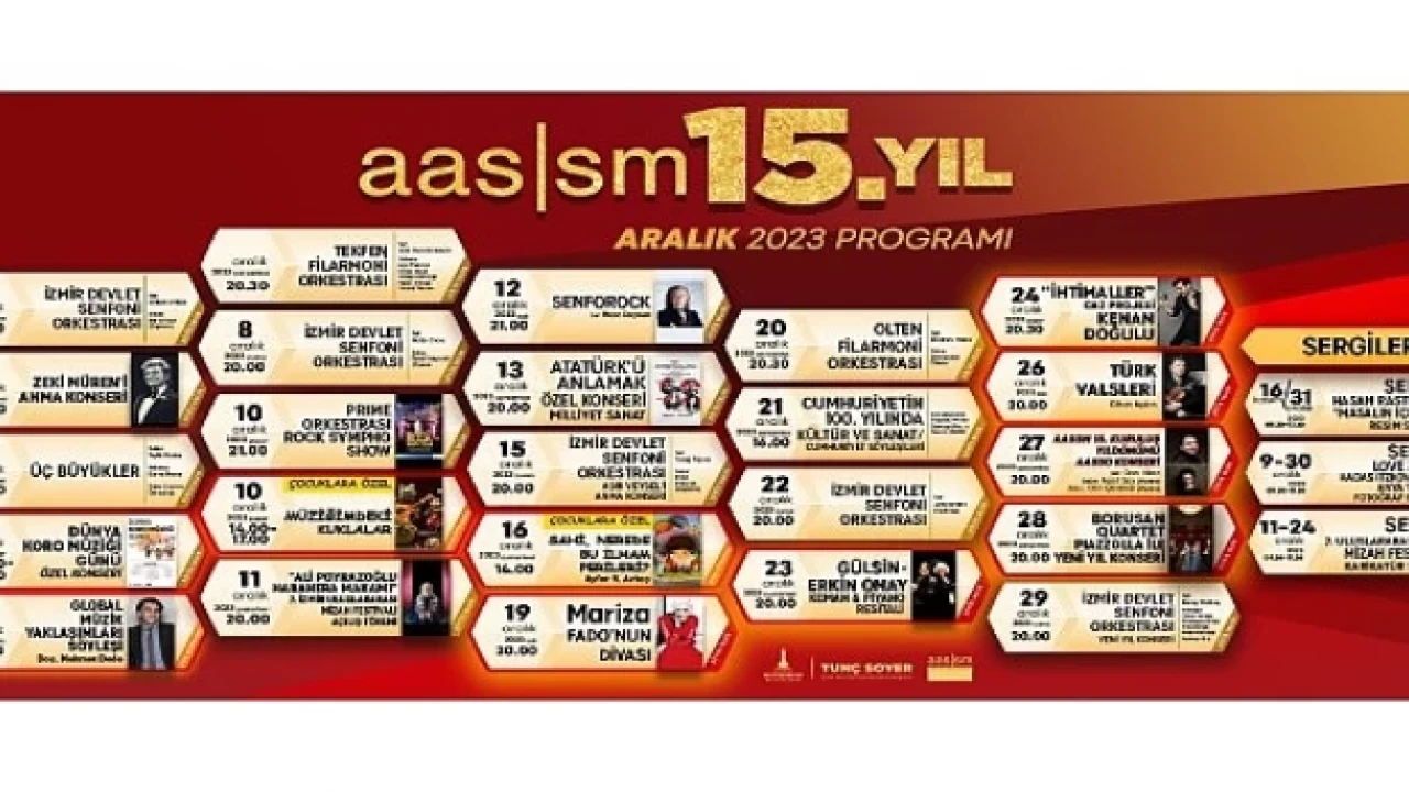 İzmir Büyükşehir Belediyesi Ahmed Adnan Saygun Sanat Merkezi (AASSM), 15. doğum gününe özel Aralık ayında yoğun bir programla İzmirliler ile buluşuyor. 19 Aralık'ta üst üste 3 kez BBC tarafından "Avrupa'nın En İyi Sanatçısı" ödülüne layık görülen fadista Mariza, 19. yüzyıldan günümüze uzanmış Portekiz halk müziği olan Fado ezgileriyle saat 20.00’de AASSM dinleyicilerine güzel bir akşam yaşatacak. 23 Aralık'ta piyano sanatçısı Gülsin Onay ve oğlu keman sanatçısı Erkin Onay, Keman & Piyano Resitaliyle yine saat 20.00’de AASSM sahnesinde olacak.