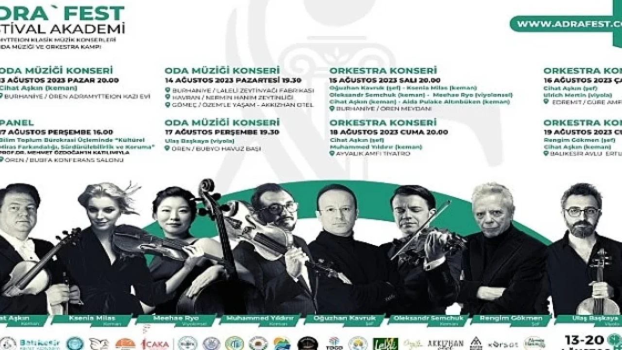 Adramytteion Festival Akademi-ADRA’FEST, 13-20 Ağustos 2023 tarihleri arasında Burhaniye-Ören’de, dünyaca ünlü keman sanatçısı Cihat Aşkın’ın sanat yönetmenliğinde gerçekleştirilecek. Türkiye’den ve Dünya’dan değerli sanatçıların genç müzisyenlerle deneyimlerini paylaşacağı orkestra kampından, konserlerden ve panelden oluşan ADRA’FEST, Adramytteion Antik Kenti ve çevre kültürel değerlerinin farkındalığı amacında, Ören-Adramytteion Antik Kenti Kültür Turizm ve Doğa Derneği’nin yürütücülüğünde düzenleniyor.